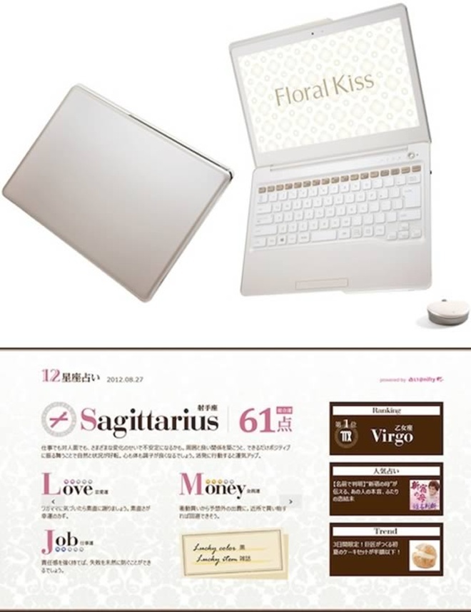 Năm 2012, hãng điện tử khổng lồ Fujitsu của Nhật Bản tung ra thị trường dòng máy tính mới dành riêng cho phụ nữ: Floral Kiss. Theo Fujitsu, nhằm mang tới vẻ duyên dáng cho máy tính, Floral Kiss được phát triển bởi một nhóm kỹ sư nữ”. Floral Kiss có 3 màu Trắng duyên dáng, Hồng nữ tính và Nâu sang trọng. Phần trên máy tính trang trí màu vàng và phần nắp gập được thiết kế để người móng tay dài có thể dễ dàng mở. Nút nguồn và Caps Lock được trang trí với đá kim cương. Floral Kiss cũng có ứng dụng thiết kế cho phụ nữ như Scrapbook, Diary và Daily Horoscopes.