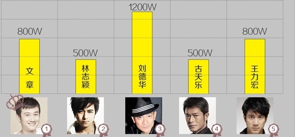 5 sao nam lọt vào danh sách sao có thu nhập khủng và giữ được hình ảnh đẹp trong mắt người hâm mộ là Văn Chương, Lâm Chí Dĩnh, Lưu Đức Hoa, Cổ Thiên Lạc và Vương Lực Hoành. Kết quả này do chính độc giả của tờ Nam Đô bình chọn dựa trên cả hai tiêu chí: kiếm tiền và không scandal của các nghệ sĩ.