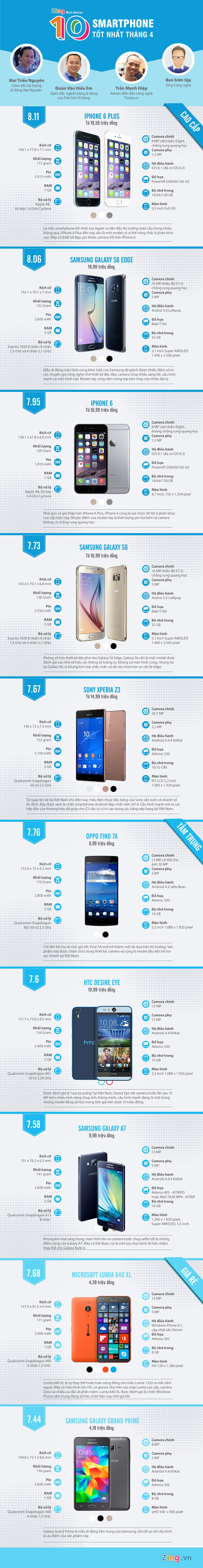 Tháng 4 có nhiều model cao cấp và máy giá rẻ lên kệ. Zenfone 5 lần đầu ra khỏi BXH sau nhiều tháng góp mặt. Galaxy S6 Edge có thứ hạng cao nhưng vẫn dưới iPhone 6 Plus.