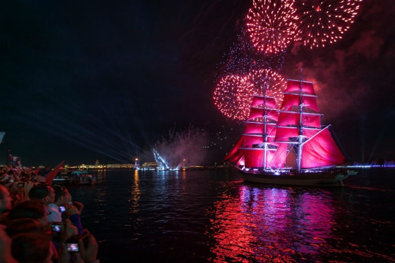 5. Lễ hội Đêm trắng và sự kiện Scarlet Sails – St Petersburg, Nga: Đêm trắng là hiện tượng thiên nhiên kỳ thú khi vào giữa mùa hè, mặt trời không bao giờ lặn ở miền Bắc nước Nga. Du khách có thể đắm mình trong không khí lễ hội với một loạt các sự kiện như biểu diễn nhạc kịch, ba lê, liên hoan phim,… Lễ hội này được tổ chức hàng năm và điểm nổi bật của lễ hội là sự kiện Scarlet Sails (Cánh buồm đỏ thắm) diễn ra vào ngày cuối cùng của lễ hội. Trên sông Neva sẽ có một màn cướp biển, sau đó là màn bắn pháo hoa đầy màu sắc, cuối cùng là sự xuất hiện của con tàu với cánh buồm đỏ thắm. Đây được coi là một sự kiện thú vị và đẹp nhất hành tinh và nó tôn vinh các nghệ sĩ sống và làm việc tại St Petersburg.