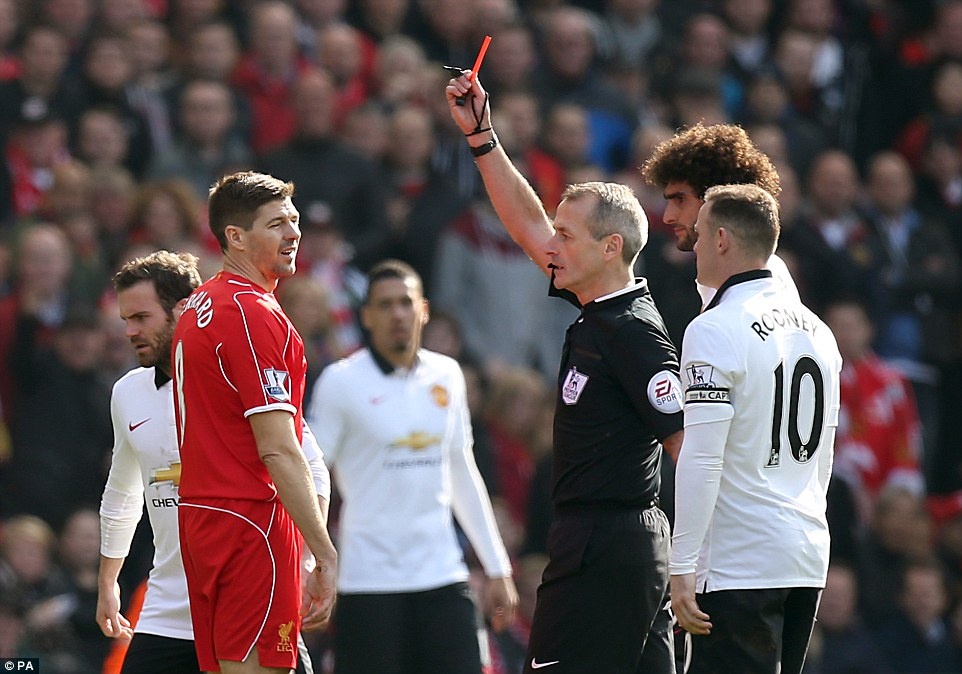 | Thẻ đỏ siêu tốc của Steven Gerrard: Trong trận đấu diễn ra tháng 3 mùa trước, Steven Gerrard nhận thẻ đỏ chỉ 38 giây sau khi vào thay Adam Lallana đầu hiệp 2. Đội trưởng của Liverpool đạp thẳng vào mắt cá chân của Ander Herrera ngay trước mặt trọng tài Martin Atkinson, buộc “ông vua áo đen” đưa ra quyết định nghiêm khắc nhất. |