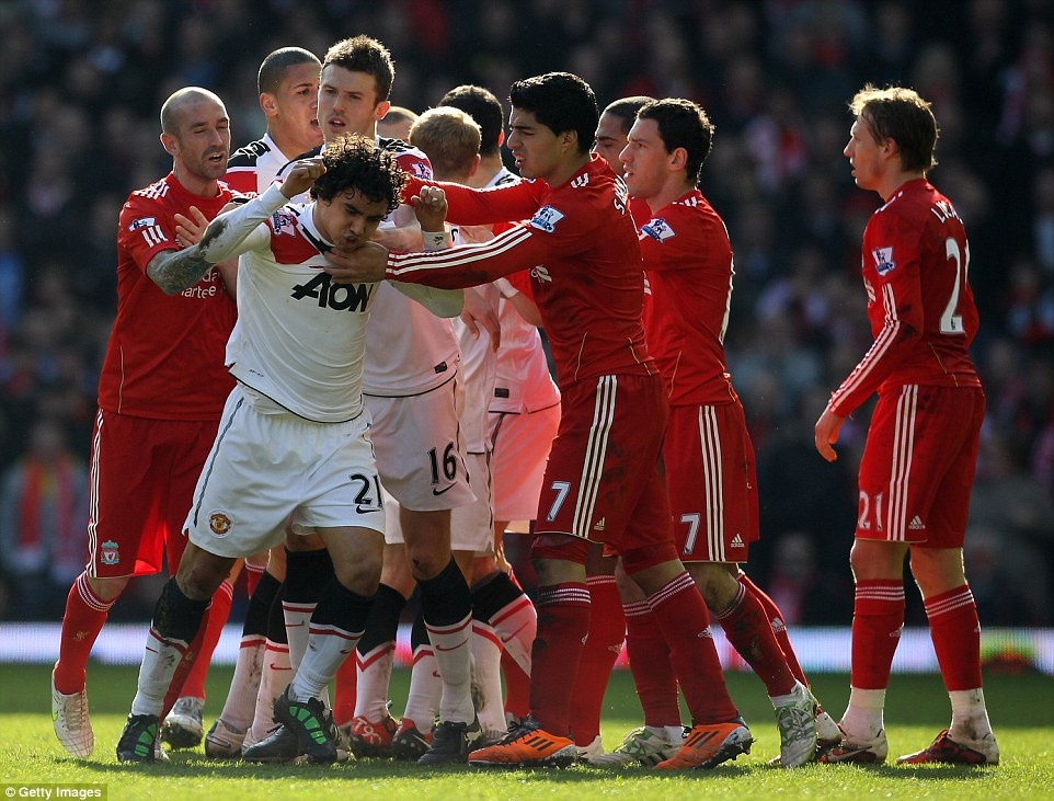 | Cuộc tranh cãi điên rồ: Có rất nhiều vụ xô xát diễn ra trong cuộc đối đầu giữa M.U và Liverpool. Tuy nhiên, cuộc ẩu đả diễn ra tháng 3/2011 dường như diễn ra theo cách đặc biệt nhất. Nani rớm máu ở ống đồng sau cú vào bóng của Jamie Carragher. Mọi chuyện chẳng quá căng thẳng nhưng một mình hậu vệ Rafael Da Silva vẫn nhất quyết ăn thua đủ với các cầu thủ chủ nhà. |