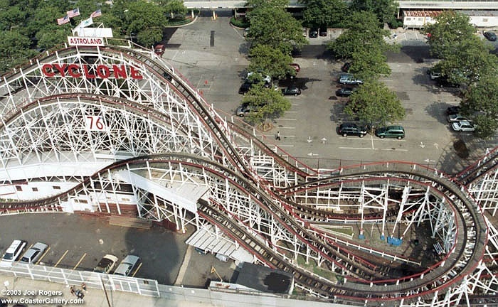 | Tàu lượn bằng gỗ lâu đời nhất Mỹ là Cyclone. Nó có chiều cao 85 mét, tại Coney Island và phục vụ du khách từ năm 1927. Người chơi chỉ đạt được vận tốc 95 km/h, không quá nhanh nhưng họ có được cảm giác sống lại thời hoàng kim của tàu lượn siêu tốc trong thế kỷ trước. |