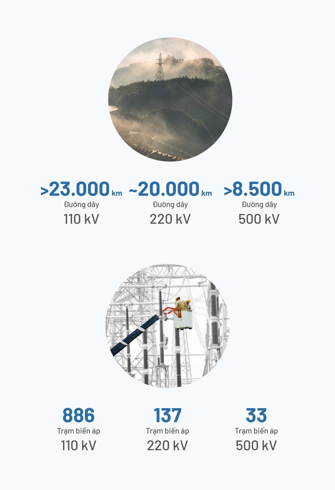 Tổng vốn đầu tư giai đoạn 2010-2019 lên đến 1.033.843 tỷ đồng. Cùng thời gian này, EVN đã hoàn thành đóng điện 1.936 công trình 110-500 kV với tổng chiều dài đường dây 8.290 km, tổng công suất các trạm biến áp (TBA) 26.123 MVA. Đến hết năm 2020, hệ thống lưới điện quốc gia đã vươn tới mọi miền đất nước với trên 8.500 km đường dây 500 kV, gần 20.000 km đường dây 220 kV, hơn 23.000 km đường dây 110 kV và 33 TBA 500 kV, 137 TBA 220 kV, 886 TBA 110 kV.