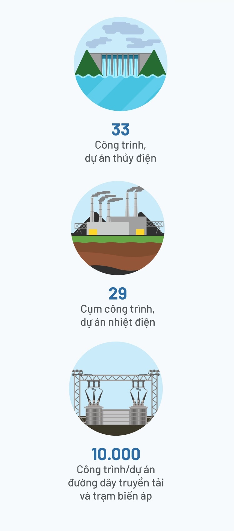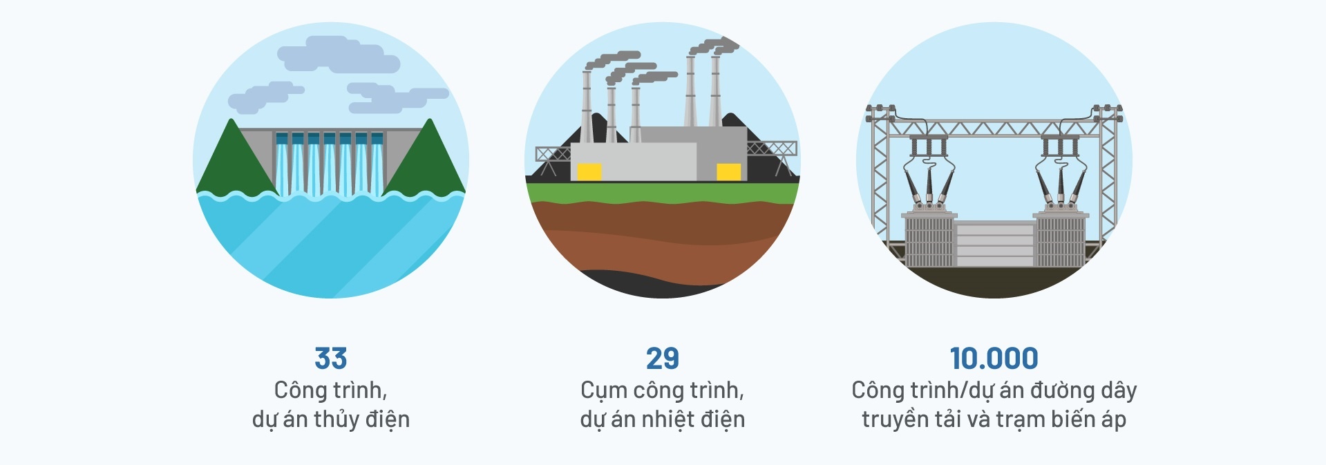 Bên cạnh đó, EVN đã đưa vào vận hành 21 dự án nguồn điện với tổng công suất 17.120 MW. Từ chỗ chỉ có 31,5 MW công suất năm 1954, đến hết 2020, tổng công suất lắp đặt của hệ thống điện quốc gia ước đạt trên 61.000 MW, trong đó công suất nguồn điện do Tập đoàn Điện lực Việt Nam (EVN) sở hữu là 29.638 MW.