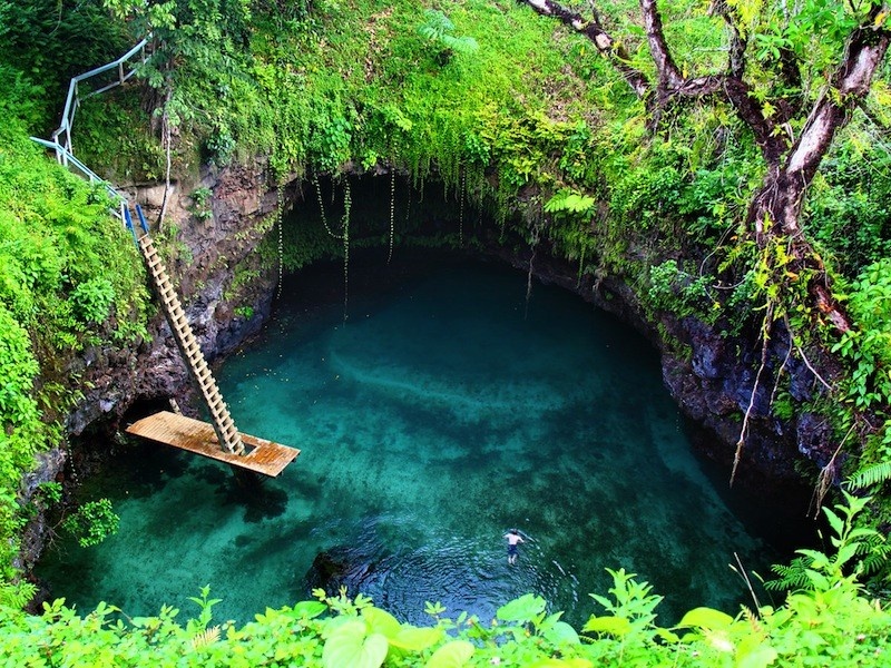9. Hồ ToSua Ocean Trench, Samoa: Tosua Ocean Trench được mệnh danh là hồ bơi khổng lồ đẹp nhất thế giới. Nằm phía Nam của hòn đảo Upolu, Samoa, hồ được bao quanh bởi những khu vườn với cảnh sắc kỳ thú và ngoạn mục. Nước hồ xanh và trong vắt, có thể nhìn thấu đáy. Điểm đặc biệt của hồ chính là bạn cần phải leo xuống một cầu thang dài để tới với hồ bơi tự nhiên này.