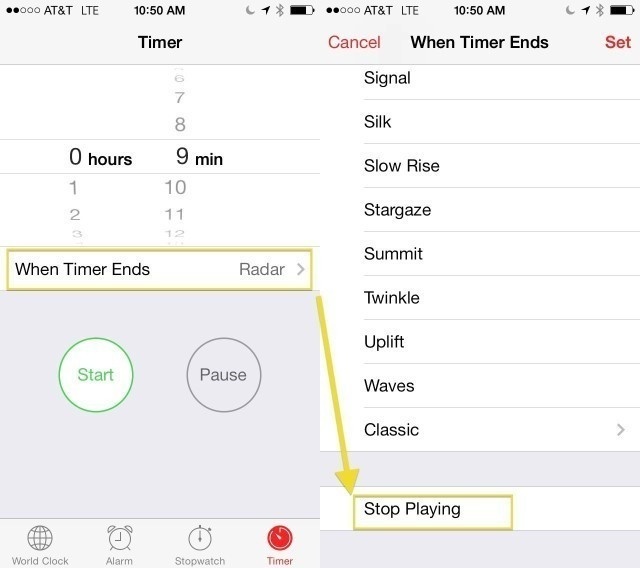 5. Nếu bạn muốn nghe nhạc hoặc audiobook khi đi ngủ, hãy đặt chế độ hẹn giờ. Đầu tiên, bạn mở ứng dụng Đồng hồ, sau đó chọn hẹn giờ ở góc phải cạnh dưới. Tại đây, bạn sẽ đặt xem mình muốn máy chơi nhạc trong bao lâu. Ở phần khi hẹn giờ kết thúc, bạn chọn Dừng phát.