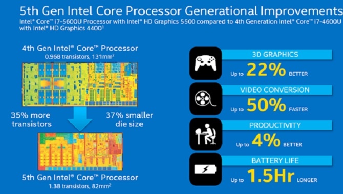 Intel vừa ra mắt chip Intel Core thế hệ thứ 5 Broadwell. Với vi xử lí mới này, chiếc laptop của bạn không chỉ hoạt động nhanh hơn mà còn tiết kiệm điện năng hơn chiếc laptop cũ cách đây 2 hoặc 3 năm.