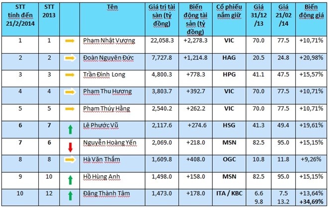 Sau gần 2 tháng, diễn biến tích cực của thị trường chứng khoán nói chung và nhóm cổ phiếu các “đại gia” nói riêng đã khiến một số vị trí top 10 người giàu nhất sàn có sự thay đổi đáng kể. Chốt phiên ngày 21/2/2014, VN-Index đứng mức 570,57 điểm, tăng 65,94 điểm, tương đương 13,06% so với phiên đóng cửa cuối năm 2013.
