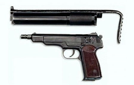 Súng ngắn giảm thanh có bộ tiêu thanh này được phát triển trên cơ sở súng ngắn Stechkin, cỡ nòng 9 mm, xạ tốc chiến đấu 90 phát/phút. Tầm bắn có ngắm là 200 m, sơ tốc đạn 340 m/s. Trọng lượng tính cả bộ tiêu thanh và đạn là 1,3 kg, dung lượng hộp đạn 20 viên.