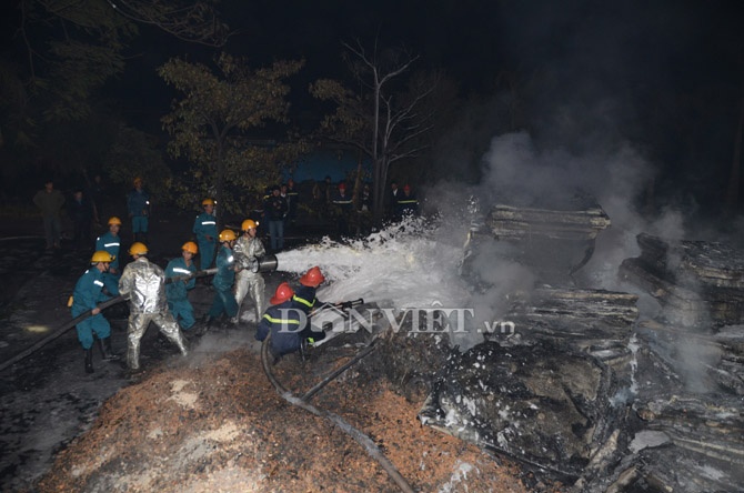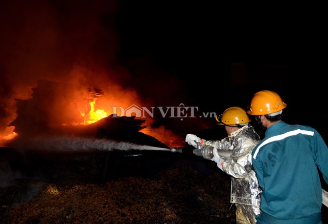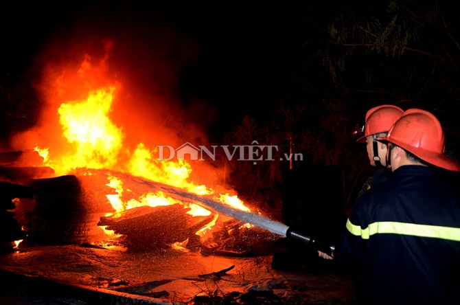 | Do chất cháy là những khối nhựa xếp chồng lên nhau thành đống lớn nên lửa bén nhanh và bốc lên ngùn ngụt. Cạnh đám cháy là nhà chứa 5 bình gas lớn và trạm điện nên nguy nổ có thể xảy ra bất cứ lúc nào. |