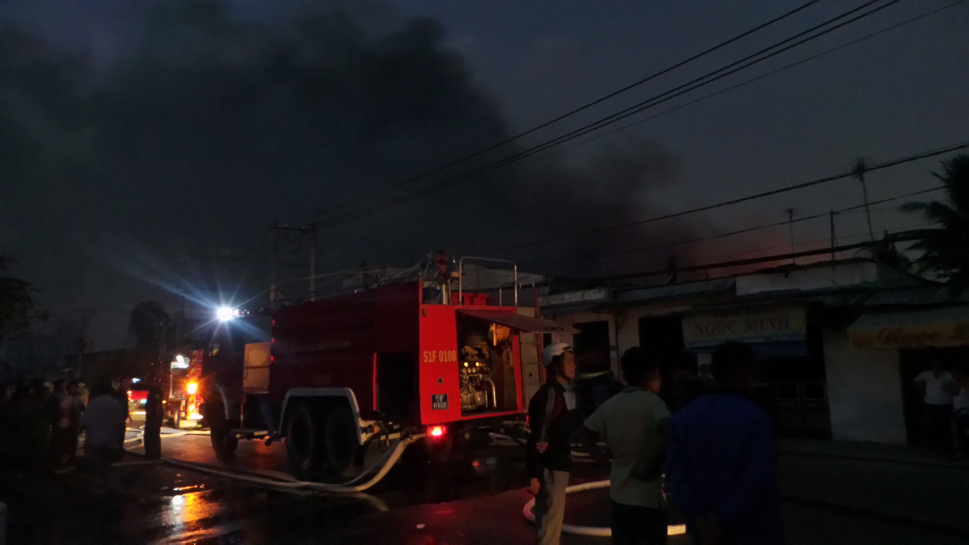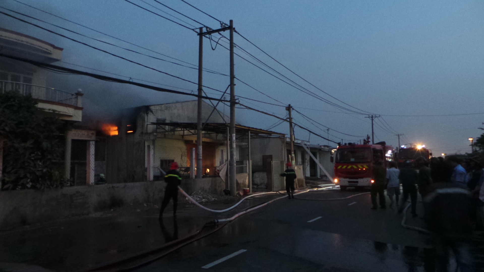 5 xe cứu hỏa cùng gần 100 chiến sĩ đã được huy động tới kho vải có diện tích khoảng 400m2 trên đường Bùi Thanh Khiết, thị trấn Tân Túc. Đám cháy bắt đầu từ khoảng 16h. |