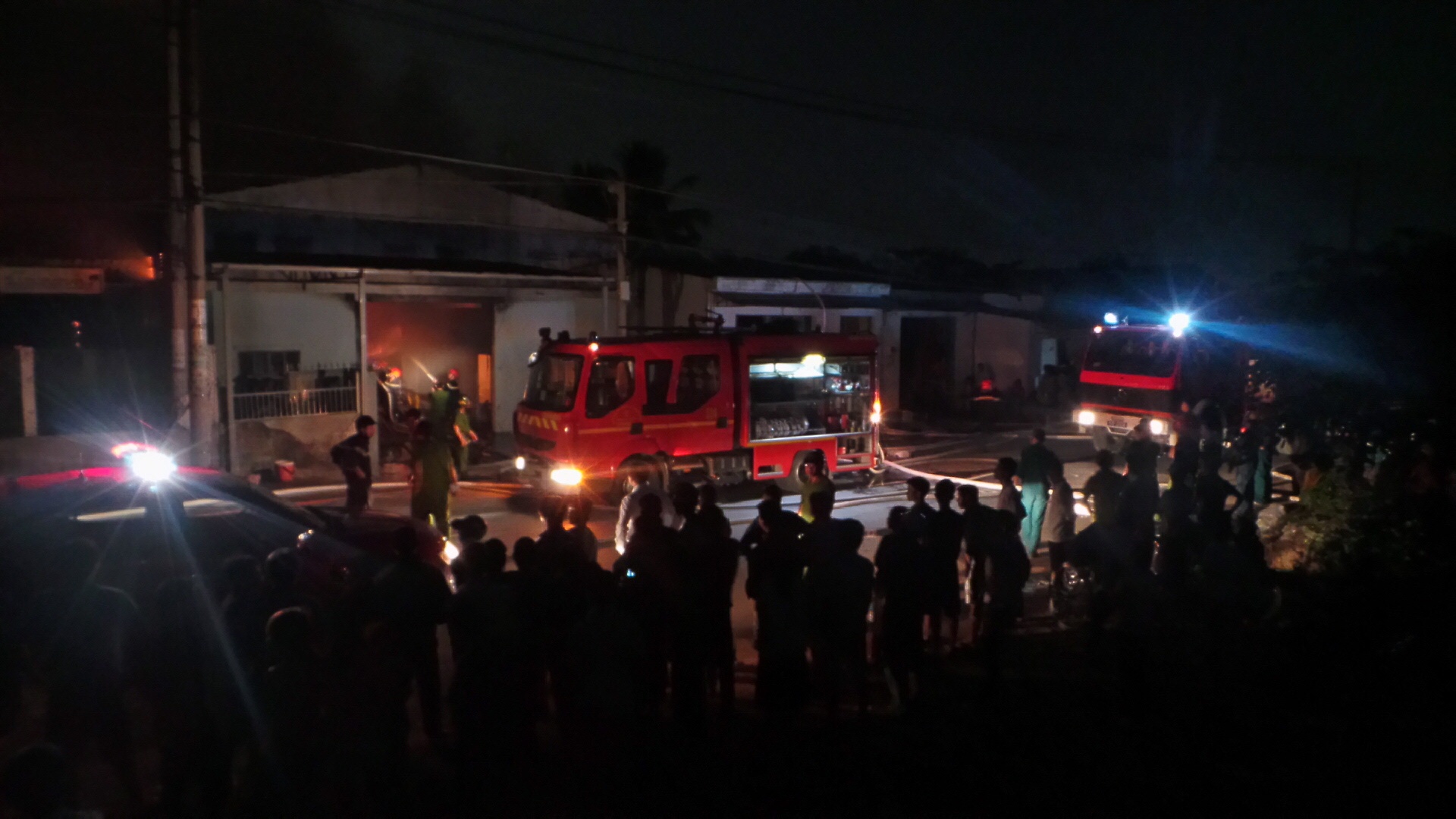 | Rất đông người tụ tập trước kho chứa vải chứng kiến công tác cứu hộ của cảnh sát PCCC. |