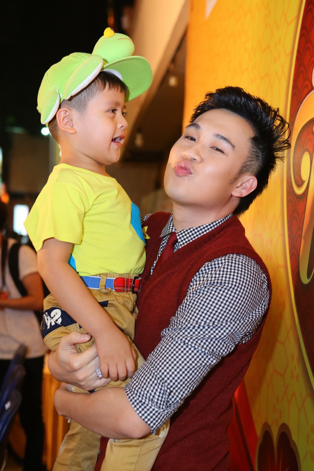 | Dương Triệu Vũ thích thú trêu đùa bé Cà phê - con trai Thanh Thúy và Đức Thịnh. |