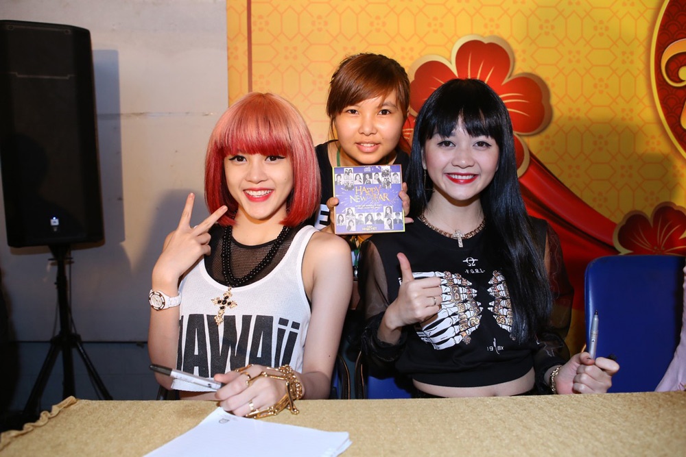 | Chị em Thiều Bảo Trang, Thiều Bảo Trâm vui vẻ ký tặng các bạn trẻ. |