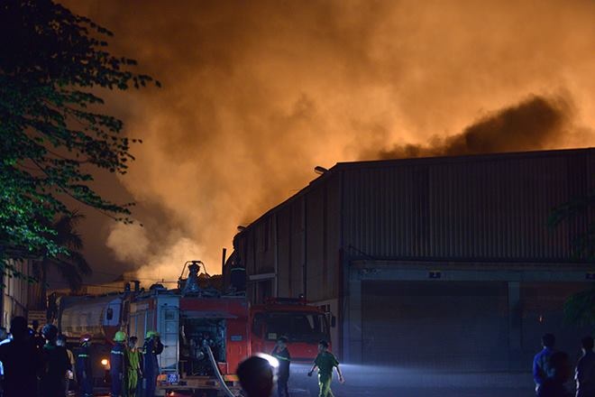 | Tuy nhiên, hơn 23h, lửa và khói vẫn bốc cao, sáng rực cả một góc khu công nghiệp Quang Minh (huyện Mê Linh, Hà Nội). Ảnh: Lê Hiếu. |
