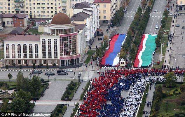 | Tại Grozny, thủ đô nước cộng hòa Chechnya thuộc Nga, hàng trăm nghìn người mặc trang phục xanh, trắng, đỏ theo màu cờ Nga xếp thành hàng với chiều dài hơn 600 m và diễu hành quanh thành phố để chúc mừng sinh nhật lần thứ 62 của Tổng thống Nga Vladimir Putin. Ảnh: AP |