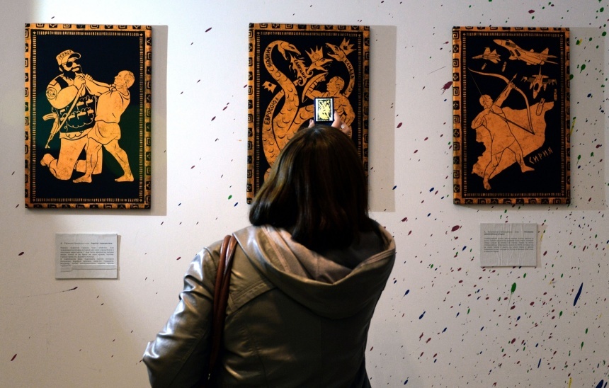 | Các bức tranh trong triển lãm ở Moscow thể hiện tổng thống Nga như thần Hercules trong thần thoại Hy Lạp, chiến đấu với ác quỷ hoặc gánh trên vai cả thế giới. Ảnh: AFP |