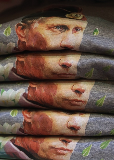 Đồ lưu niệm và áo phông có hình ảnh của Putin trở thành món hàng mà người ta săn lùng ở các cửa hàng khắp nước Nga. Ảnh:Reuters