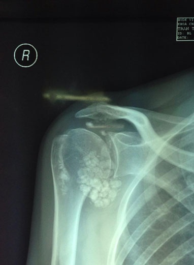 Gần đây do vai ngày càng đau, bệnh nhân đã đến khám tại bệnh viện Việt - Tiệp Hải Phòng và được phát hiện hàng trăm viên sỏi lấp đầy khớp vai phải.