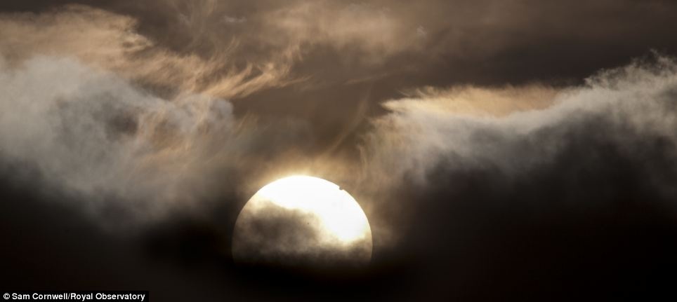 | Sao Kim di chuyển ngang qua mặt trời. Trong ảnh, sao Kim là chấm nhỏ ở rìa phía trên của mặt trời. |