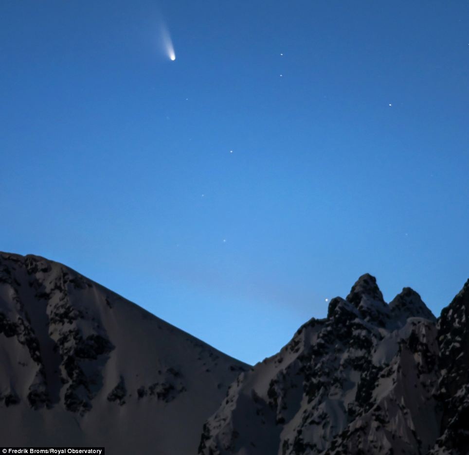 | Sao chổi Panstarrs xuất hiện phía trên một dãy núi tại Na Uy. |