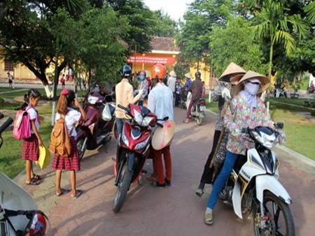 | Phụ huynh đón con sau buổi lao động công ích. |