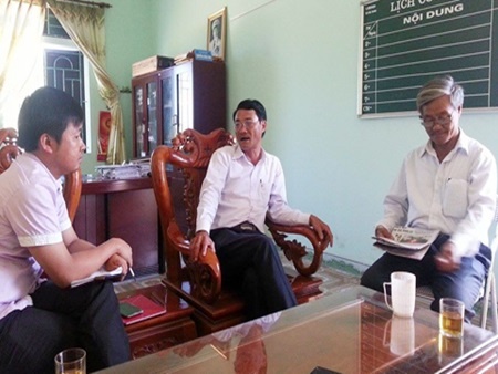 | Lãnh đạo xã Kỳ Xuân trao đổi sẽ kiểm tra lại phản ánh của người dân. |