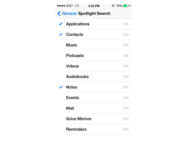 | Tiết kiệm pin với Spotlight Search: Spotlight là một tính năng hay trên iOS, cho phép tìm kiếm nhanh bất cứ nội dung gì trên iPhone, iPad. Cũng do đó, tính năng này phải liên tục tìm kiếm thông tin mới trên thiết bị iOS của bạn. Để tiết kiệm pin, người dùng truy cập Settings > General > Spotlight, bỏ dấu tick trên các ứng dụng không cần thiết cho việc tìm kiếm. |