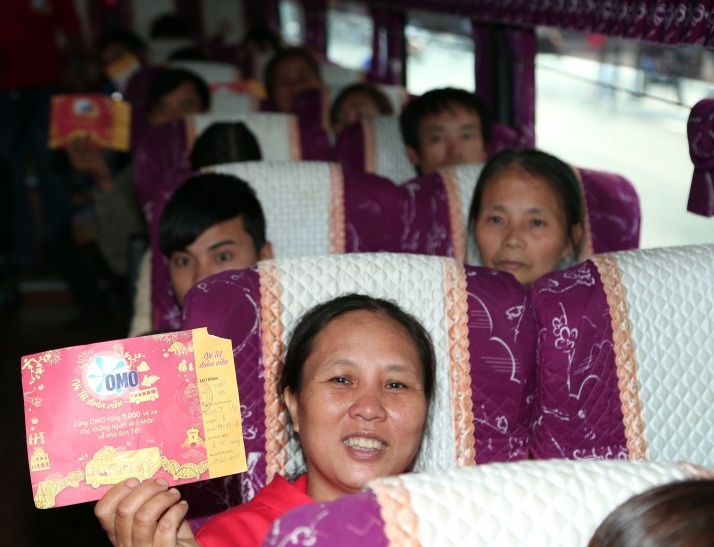 Từ ngày 10/2 đến ngày 16/2, nhãn hàng OMO tổ chức 117 chuyến xe đoàn viên, lần lượt đưa 5000 người có hoàn cảnh khó khăn trên khắp đất nước về quê sum họp với gia đình. Trong đó, tại TP HCM có 109 chuyến đến Hà Nội, Đà Nẵng, Quảng Nam, An Giang, Kiên Giang; Bạc Liêu, Cà Mau, Huế, Quảng Trị, Bình Định, Quảng Ngãi, Gia Lai, Đắk lắk. Tại Hà Nội sẽ có 8 chuyến đến Nghệ An, Thanh Hóa.