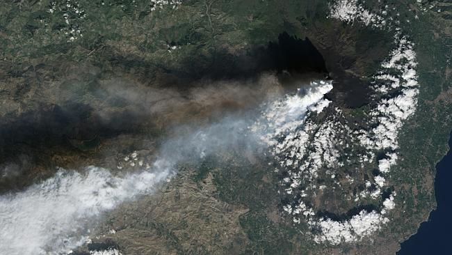 | Hai cột khói trắng và đen bay lên từ miệng núi lửa Etna trên đảo Sicily, Italy hôm 26/10. Cột khói trắng là khí, còn cột khói đen là tro. Ảnh: NASA |