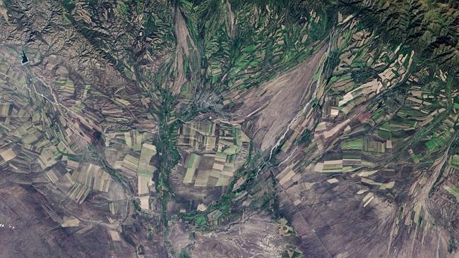 | Những đồng ruộng tại Kazakhstan vào vụ thu hoạch mùa thu hôm 9/9. Ảnh: NASA |
