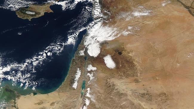 | Tuyết rơi ở Trung Đông trong tháng 12. Đây là hiện tượng vô cùng hiếm tại khu vực này. Ảnh: NASA |