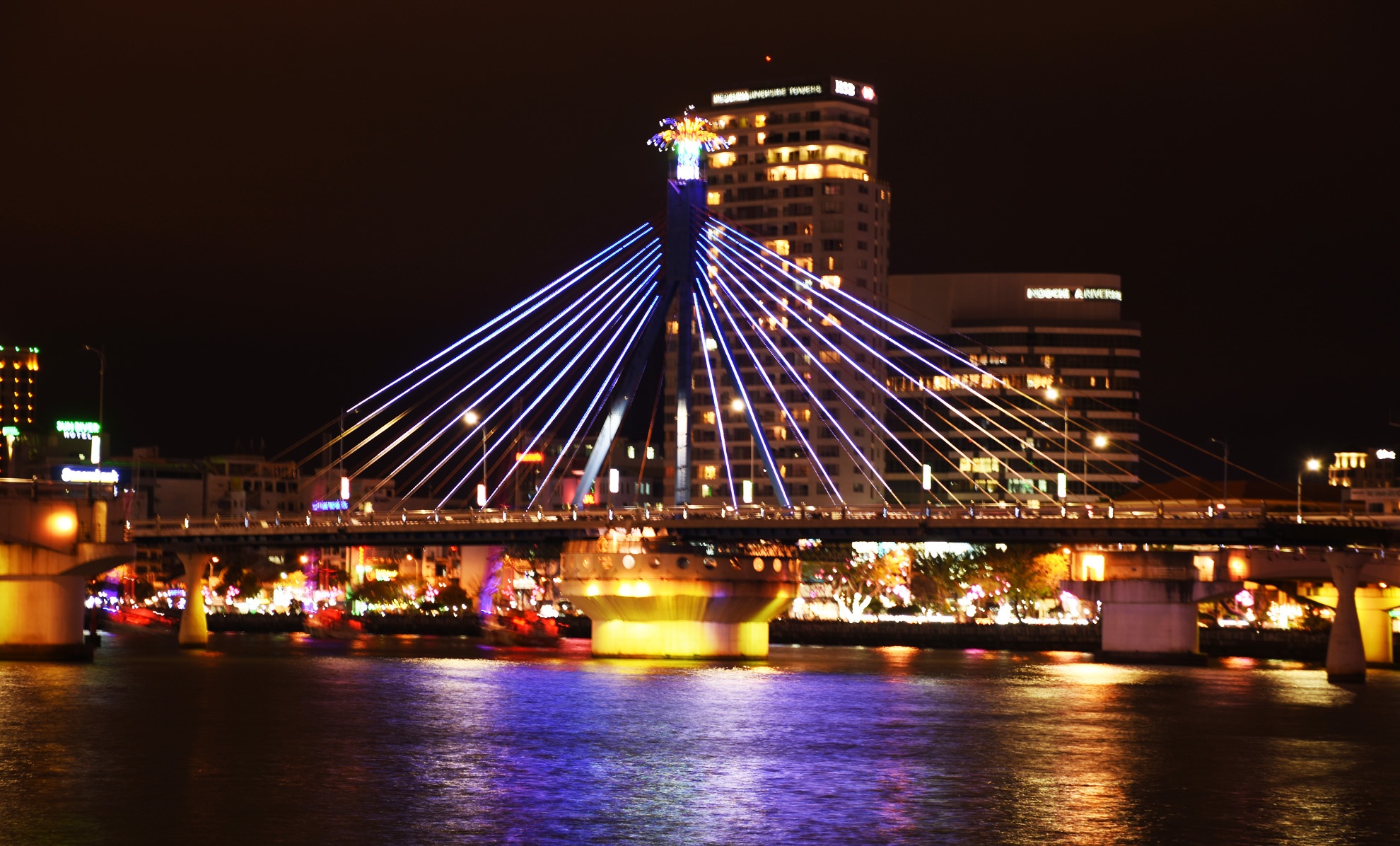 | Để phục vụ các thuyền buồm diễu hành, cầu sông Hàn được vận hành quay đậu lên hai trụ ở giữa sông. Ảnh: Ngọc Minh. |