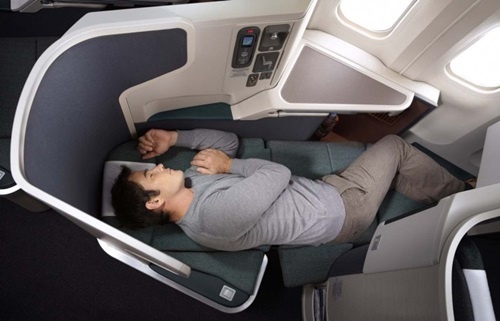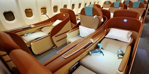 Trang bị một trong những loại ghế ngồi hạng thương gia rộng nhất thế giới, hơn 81cm, và lối đi rộng gấp đôi thông thường, mục tiêu của hãng hàng không Cathay Pacific là hướng tới sự thoải mái cao nhất của hành khách. Khách bay hạng thương gia cũng được phục vụ thực đơn cao cấp và phong phú. Năm 2013, Cathay Pacific được Skytrax bình chọn là hãng hàng không có đội tiếp viên tốt nhất thế giới. Giá vé khứ hồi hạng thương gia từ Los Angeles, Mỹ tới Bắc Kinh, Trung Quốc là 6.156 USD.