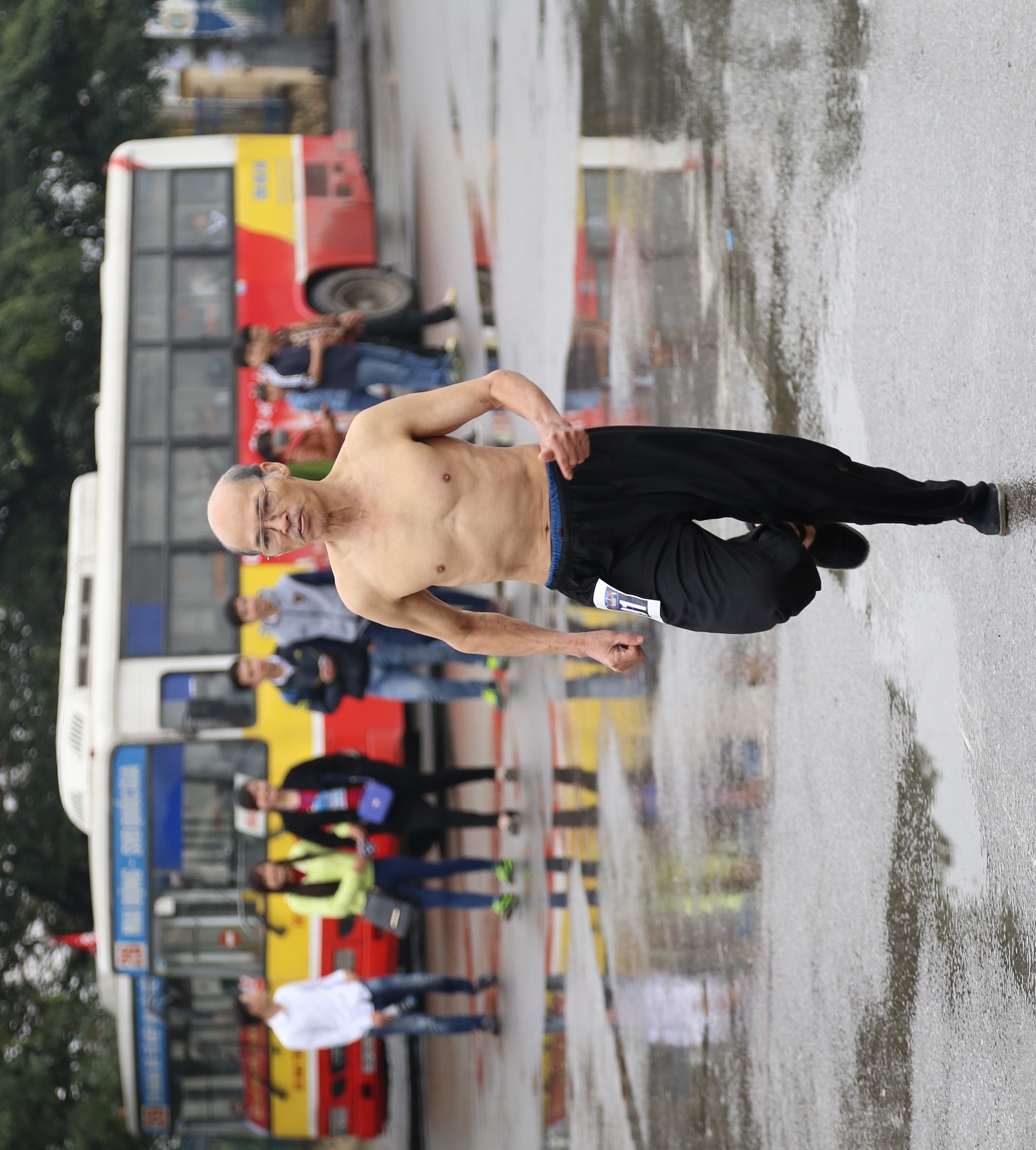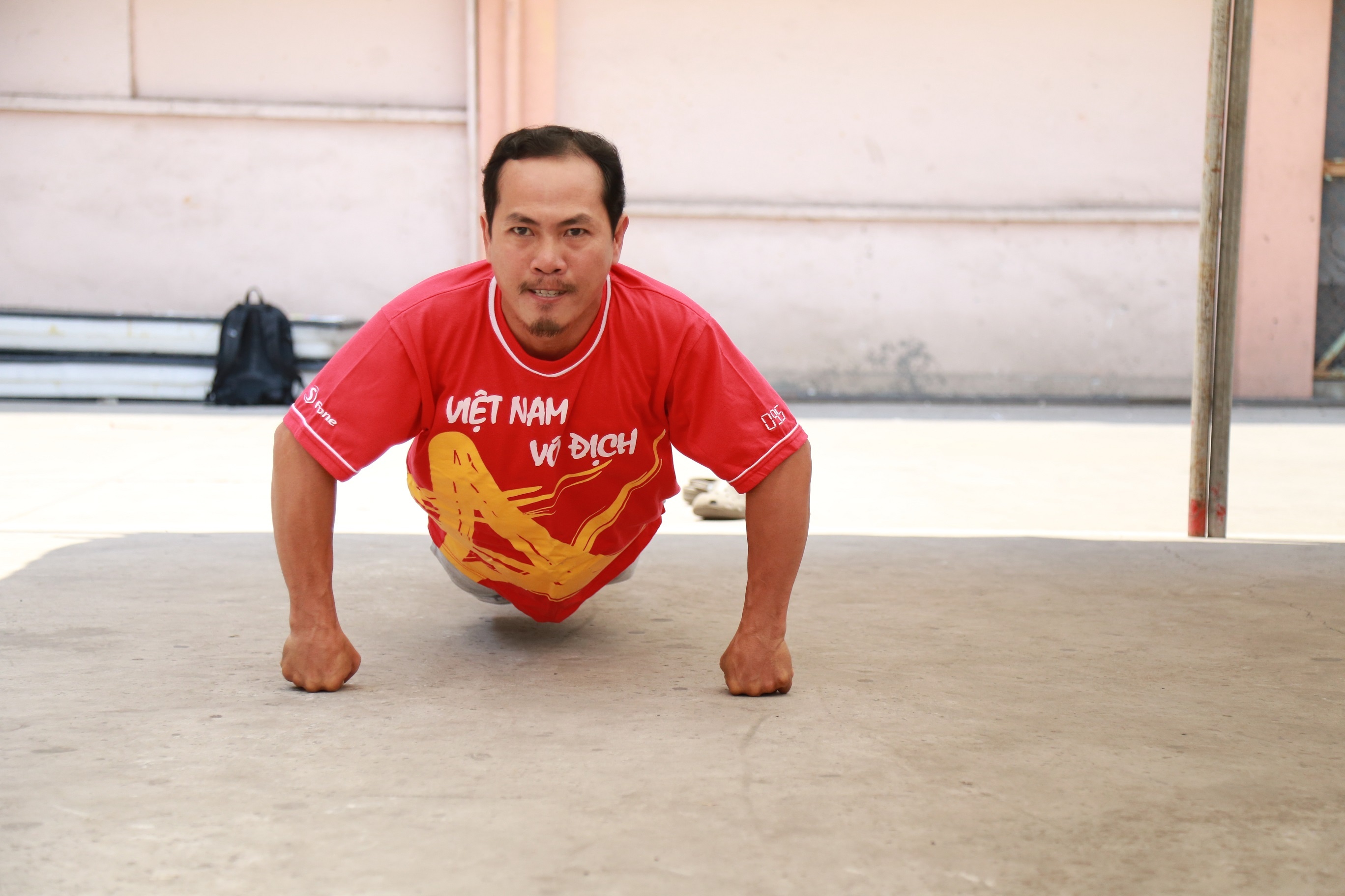 Tô Mạnh Phát (46 tuổi) trong phần thử chống đẩy. Anh gây chú ý khi mặc áo đỏ với dòng chữ "Việt Nam vô địch".