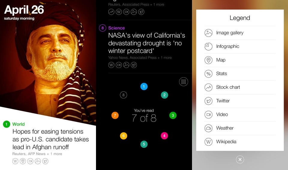 Yahoo News Digest. Năm ngoái, Yahoo cũng giành giải Apple Design Award cho ứng dụng thời tiết. Năm nay, họ tiếp tục nhận thêm một giải thưởng cho công cụ đọc (reader) của mình.