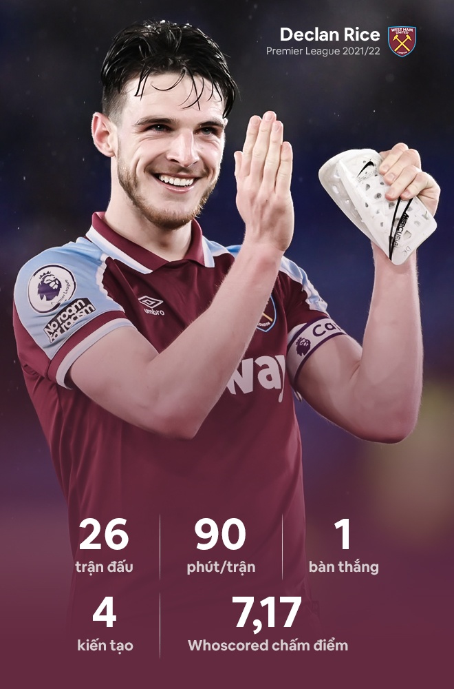 Declan Rice, 23 tuổi, đang chơi mùa giải thứ 6 tại Premier League trong màu áo West Ham. Mùa này, Rice tiếp tục là lựa chọn không thể thay thế ở tuyến giữa West Ham và có bước tiến nhanh để vươn tầm từ một hiện tượng trở thành tiền vệ hàng đầu Premier League.