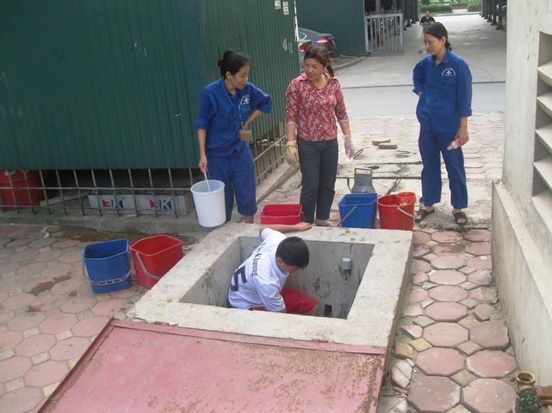 | Các hộ dân khu đô thị Dịch Vọng (Cầu Giấy, Hà Nội) xách xô xuống bể vét nước sạch. Ảnh: Nguyễn Hưởng. |