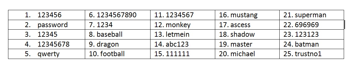 Dưới đây là danh sách 25 mật khẩu phổ biến nhất năm 2014: