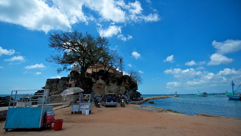 | Đồi đá Dinh Cậu cách trung tâm thị trấn Dương Đông chừng vài trăm mét và được xem như biểu tượng của Phú Quốc. Trên ghềnh đá nổi là ngôi đền linh thiêng mà các ngư dân thường khấn vái trước khi đưa tàu ra khơi. Ảnh: dulich4phuong. |