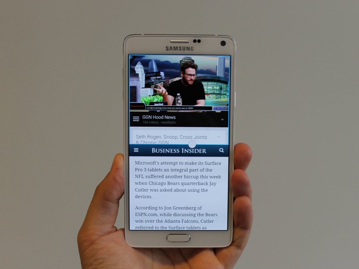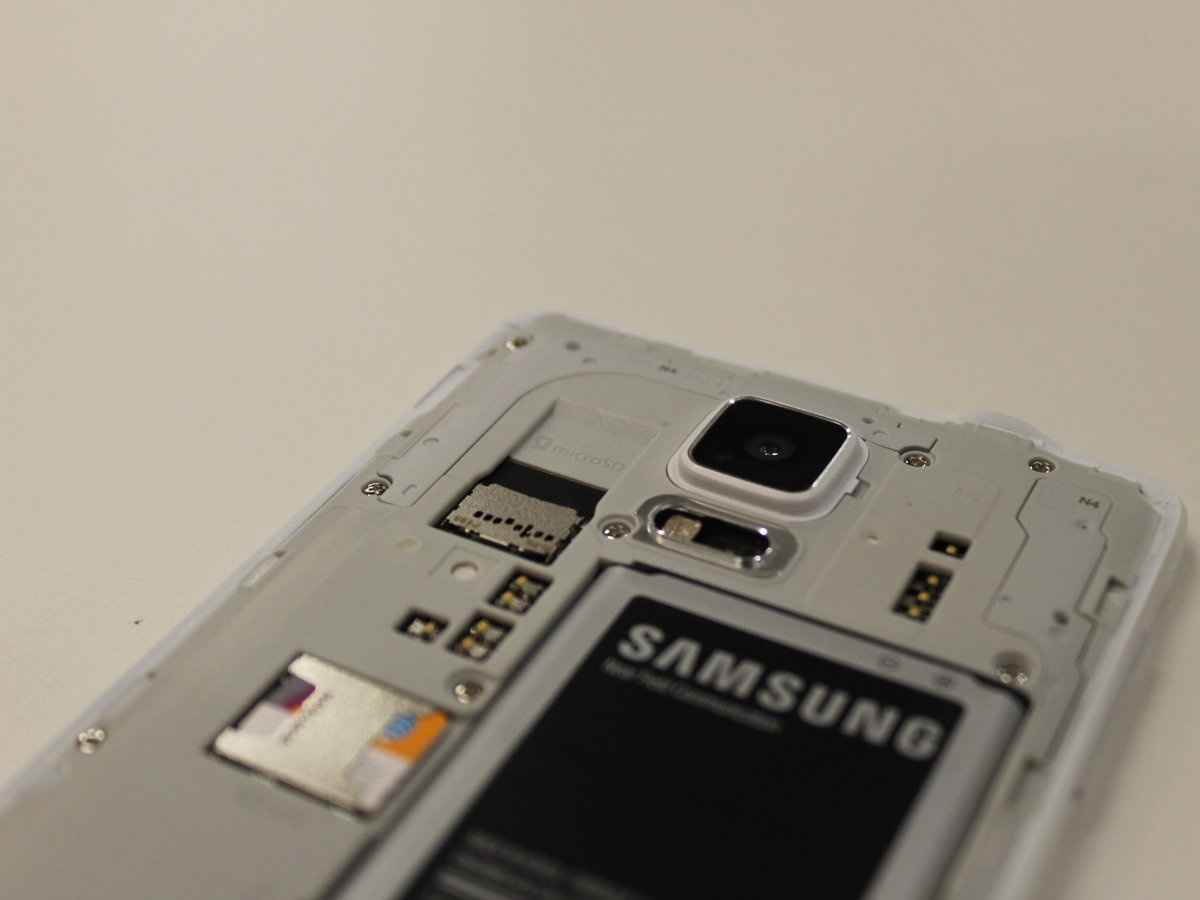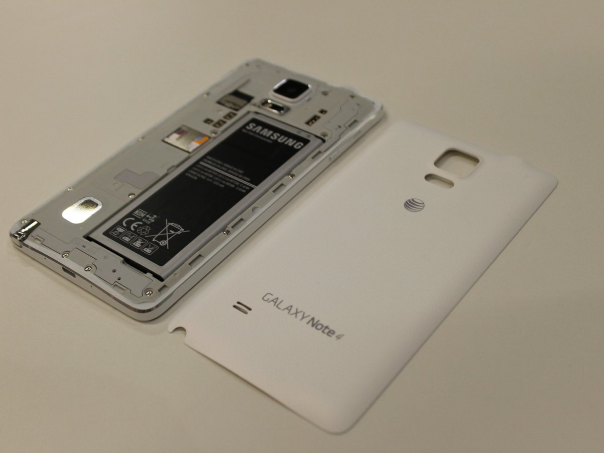 Note 4 không có thiết kế nguyên khối để bạn có thể tháo vỏ máy và thay pin khi hết pin. |