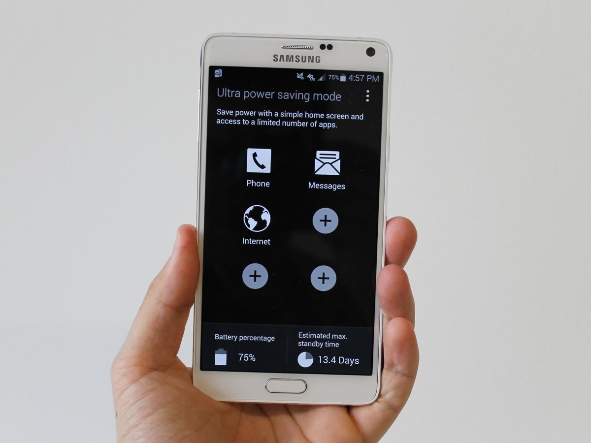 Chế độ siêu tiết kiệm năng lượng giúp bạn có thêm vài giờ dùng Note 4 khi sắp hết pin. Nó đưa màn hình về màu đen trắng, chỉ làm một số tác vụ như gọi điện, duyệt web và mở vài ứng dụng hạn chế. |