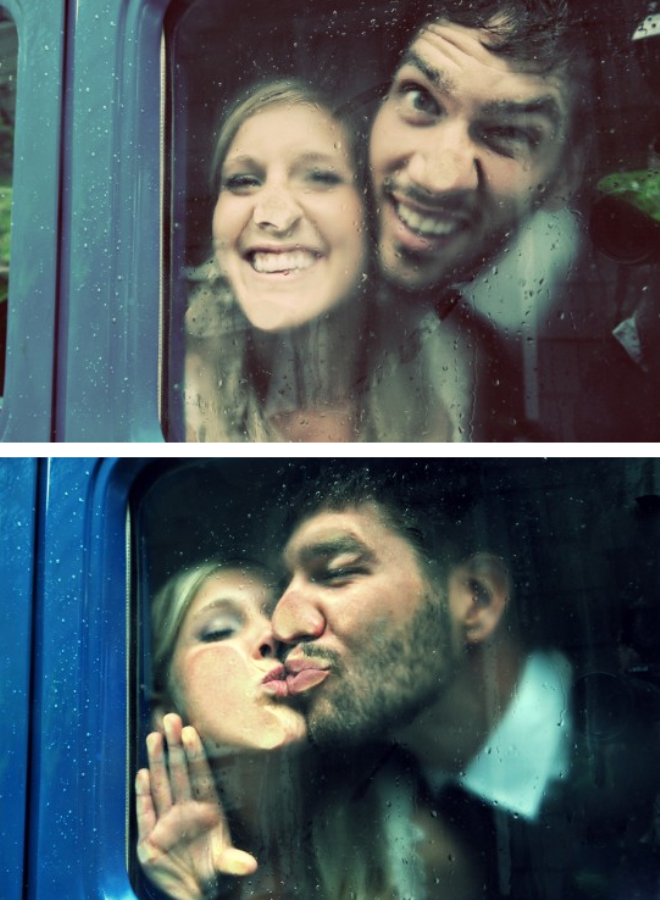 | Thay vì tỏ ra khó chịu, đôi trẻ lại khá rạng rỡ, vui vẻ dù bên ngoài trời đang mưa lớn. |