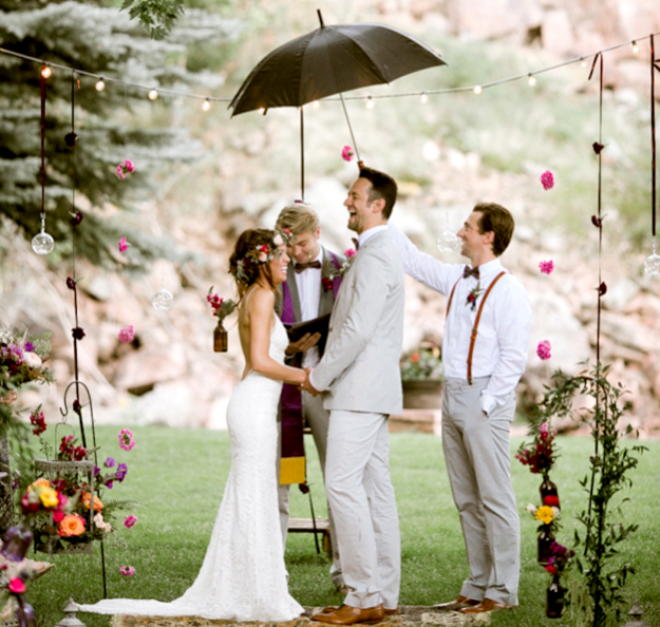 | Lễ kết hôn ngoài trời càng thêm ý nghĩa, khó quên hơn nhờ những hạt mưa phùn. |