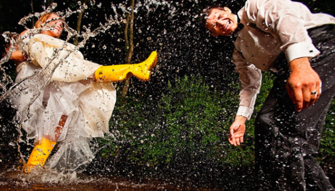 | Khoảnh khắc có một không ai - cô dâu, chú rể vui đùa nhắng nhít bên một vũng nước lớn. |