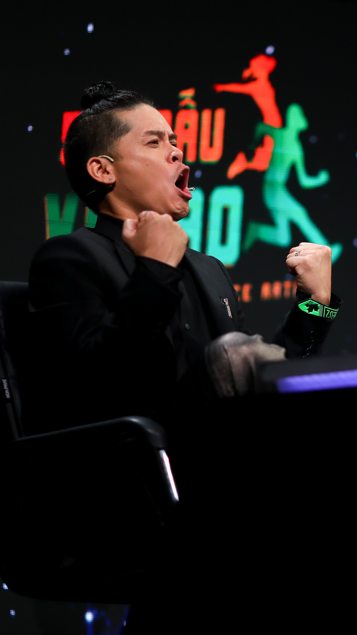 | Do tình hình dịch bệnh căng thẳng, ê-kíp chia ca ghi hình, mọi người có mặt trong trường quay đều phải đeo mặt nạ chống bắn giọt để đảm bảo an toàn. Theo thiết kế sân khấu, có tiết mục phải quay theo lối one-take. Do đó, tôi phải đứng cạnh và điều hướng giúp anh bạn cầm camera, đảm bảo ống kính di chuyển theo dự tính để có hiệu quả hình ảnh tốt nhất. |