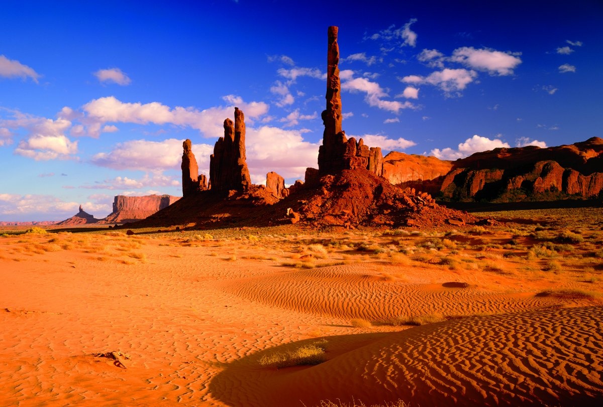 | Các cột đá màu đỏ ở công viên thung lũng Monument tại biên giới Arizona-Utah, Mỹ. Những cột đá sa thạch tại đây là kết quả của quá trình xói mòn kéo dài hàng triệu năm. Chúng có màu đỏ là do có oxit sắt. Ảnh: Getty Images |