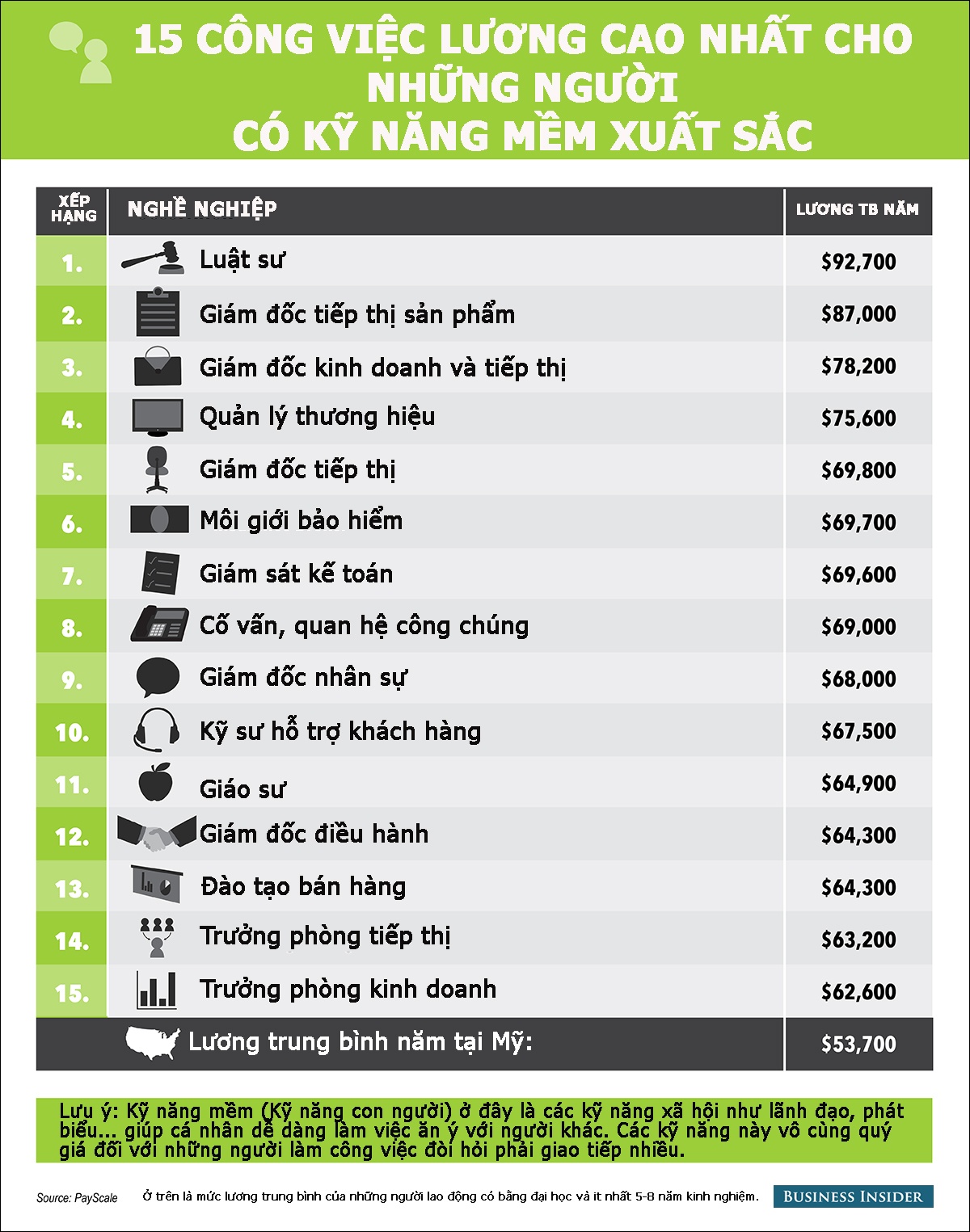 Dưới đây là 15 công việc có lương cao dành cho người sở hữu những kỹ năng mềm (kỹ năng con người – People Skills) xuất sắc do trang PayScale đưa ra.