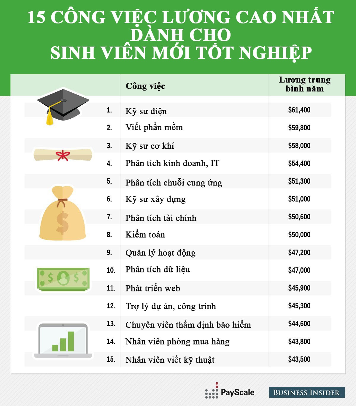 Payscale là tổ chức có cơ sở dữ liệu lương thưởng cá nhân lớn nhất thế giới (hơn 15 triệu hồ sơ). Danh sách này được đưa ra dựa trên mức lương trung bình, bao gồm lương hàng năm, hàng giờ, thưởng, hoa hồng, tiền boa hay các dạng thu nhập tiền mặt khác đối với những người có kinh nghiệm làm việc dưới 2 năm hoặc mới tốt nghiệp đại học.